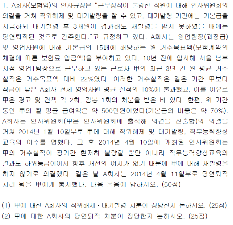 시험과목의 관점에서 보면 1차 시험문제는 노동법(1), 노동법(2), 민법, 사회보험법, 경제원리, 기업경영, 2차 시험문제는 노동법이다. 법학, 인사관리론, 행정분쟁법, 경영조직론, 노동경제학, 민사소송법 최종 단계인 3차 시험은 인증자에 대한 시행령 제4조 제3항의 평가 항목에 대한 것임을 확인하시기 바랍니다. 노무사법. 당신은 할 것입니다. 다음과 같습니다.