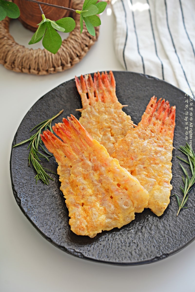 냉동 새우 50마리 후추 약간 맛술 1 tbsp 부침가루 1/2컵 달걀 8개 소금 1/4 tbsp 당근 약간 대파 약간
